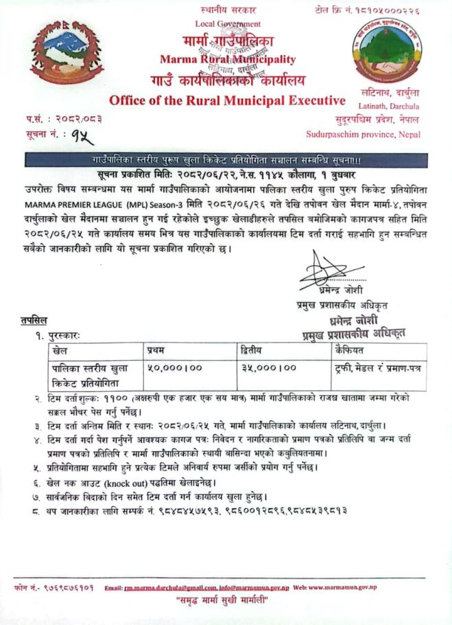 » गाउँपालिका स्तरीय पुरुष खुला क्रिकेट प्रतियोगिता सञ्चालन हुने बारे सूचना ।