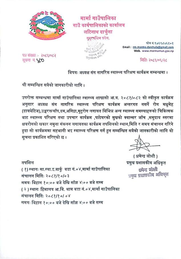 » अध्यक्षसंग नागरिक स्वास्थ्य परिक्षण कार्यक्रम सम्बन्धी सूचना ।