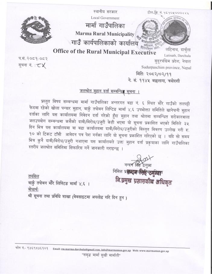 जलश्रोत मुहान दर्ता सम्बन्धि सूचना ।